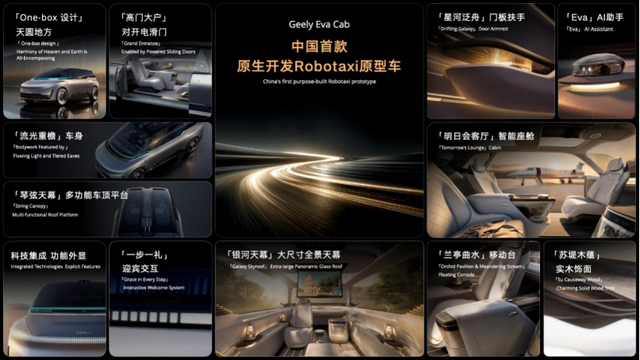 真正让我改变看法的,是吉利发布的一款名为Eva Cab的原型车。 它是中国首款原生开发的Robotaxi,也就是为自动驾驶出租车而生的产品,不是后期改装,而是从头设计的。