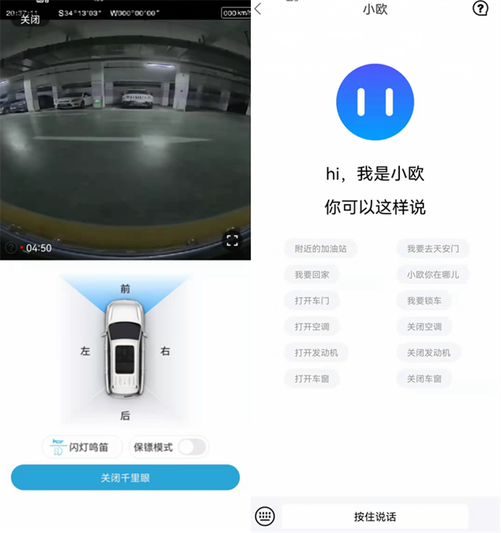 此外,APP还支持“千里眼”功能,可远程观察车辆周围状态,令找车变得更加容易;“顺风耳”功能则支持语音远程控制,只需说一句“打开发动机”,即便是在车辆未解锁的情况下,发动机也将正常运行。
